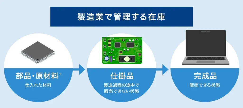 具体的には、製造工程に応じて「部品・原材料」「仕掛品」「完成品」の3種類に分類されます。