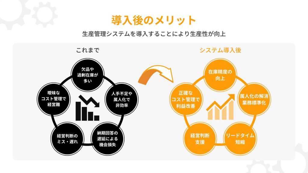 - 生産管理システムで在庫や原価が正確になり、業務が標準化される。
